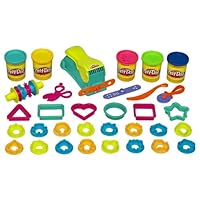 Press out squiggly shapes with the fun factory or mold birds cars, fish and lots more. Includes: 22 cutters, scissors, plastic knife, pizza cutter. Roller (7 pieces), fun factory with 2 rails, play mat and 5 five-ounce cans of play-doh brand modeling compound.